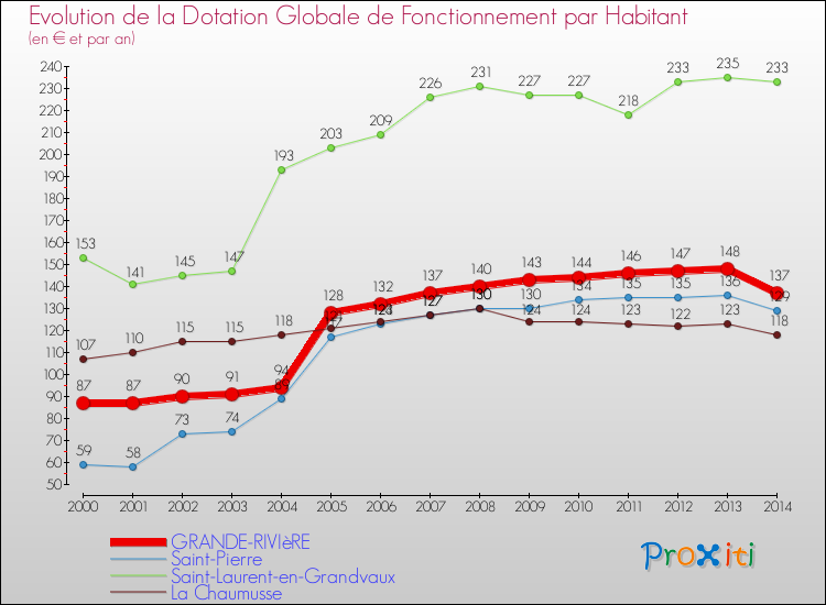 Dans le même temps, la Dotation Globale de Fonctionnement accordée aux communes françaises similaires à Grande-Rivière était de 199 € par habitant, en 2014.