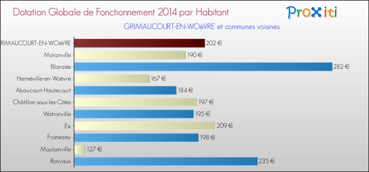 Le graphique ci dessous indique la Dotation Globale de Fonctionnement accordée par habitant à Grimaucourt-en-Woëvre en 2014 par rapport aux communes voisines.