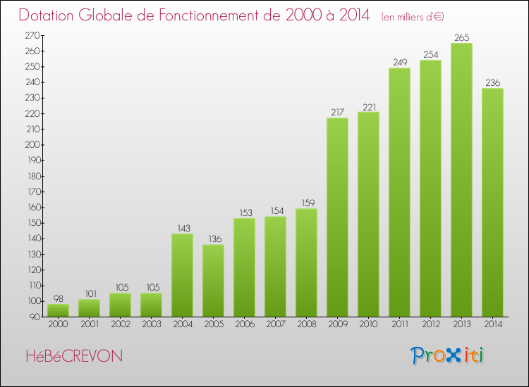 Dans le même temps, la Dotation Globale de Fonctionnement accordée aux communes françaises similaires à Hébécrevon était de 171 € par habitant, en 2014.