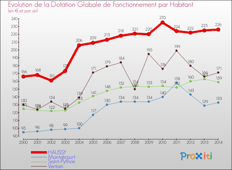 Dans le même temps, la Dotation Globale de Fonctionnement accordée aux communes françaises similaires à Haussy était de 171 € par habitant, en 2014.