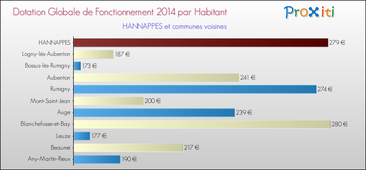 Le graphique ci dessous indique la Dotation Globale de Fonctionnement accordée par habitant à Hannappes en 2014 par rapport aux communes voisines.