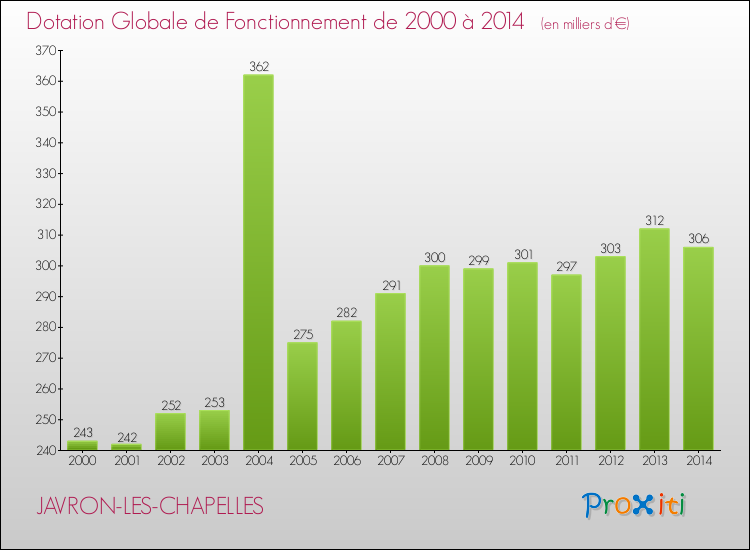 En effet, la dotation globale de fonctionnement versée par l'état en 2014 à la seule commune de Javron-les-Chapelles était de : 306 000 € au total.