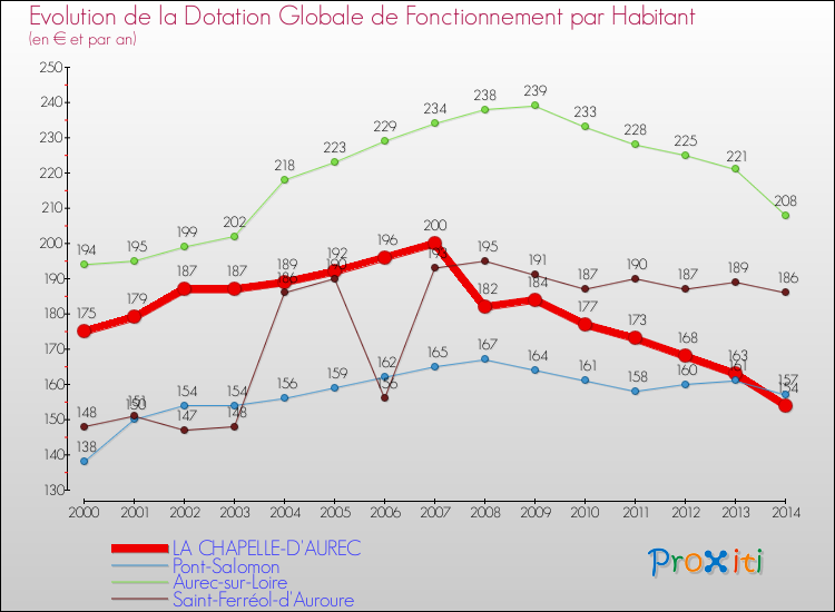 Dans le même temps, la Dotation Globale de Fonctionnement accordée aux communes françaises similaires à La Chapelle-d'Aurec était de 171 € par habitant, en 2014.