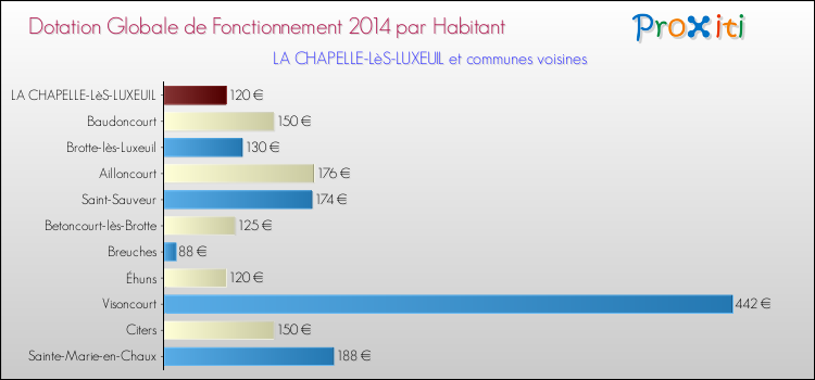 Le graphique ci dessous indique la Dotation Globale de Fonctionnement accordée par habitant à La Chapelle-lès-Luxeuil en 2014 par rapport aux communes voisines.