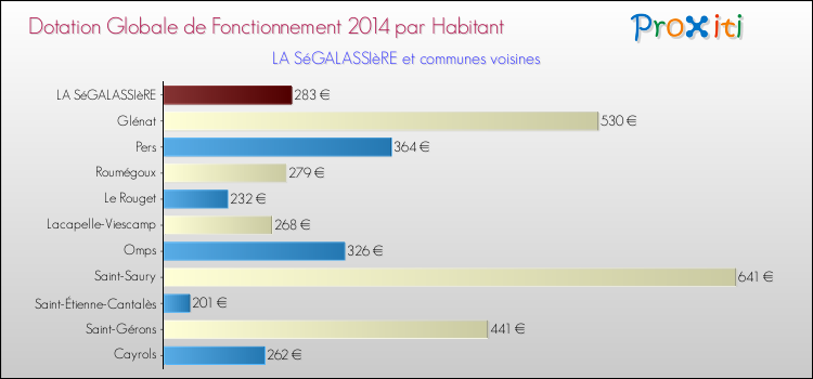 Le graphique ci dessous indique la Dotation Globale de Fonctionnement accordée par habitant à La Ségalassière en 2014 par rapport aux communes voisines.