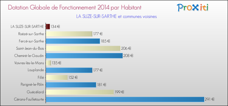 Le graphique ci dessous indique la Dotation Globale de Fonctionnement accordée par habitant à La Suze-sur-Sarthe en 2014 par rapport aux communes voisines.