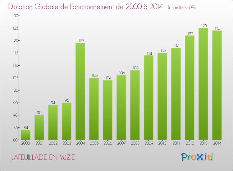 En effet, la dotation globale de fonctionnement versée par l'état en 2014 à la seule commune de Lafeuillade-en-Vézie était de : 124 000 € au total.