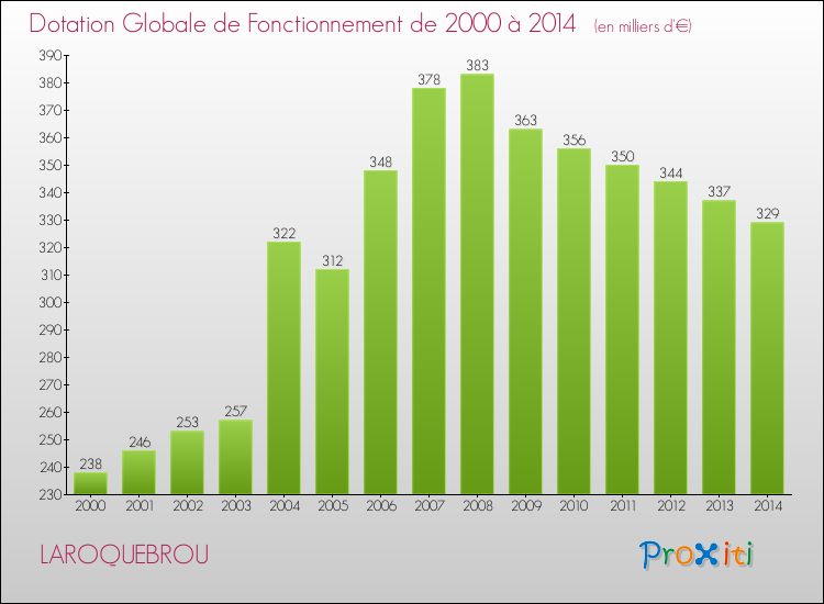 Dans le même temps, la Dotation Globale de Fonctionnement accordée aux communes françaises similaires à Laroquebrou était de 216 € par habitant, en 2014.