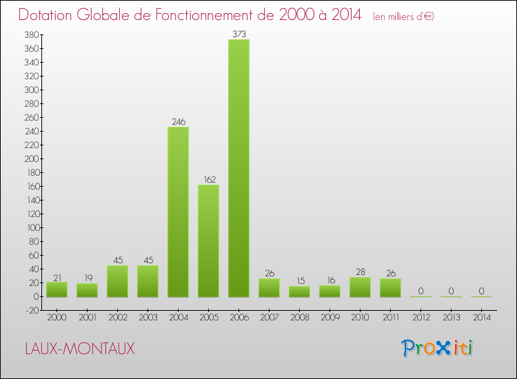 En effet, la dotation globale de fonctionnement versée par l'état en 2014 à la seule commune de Laux-Montaux était de : 0 € au total.