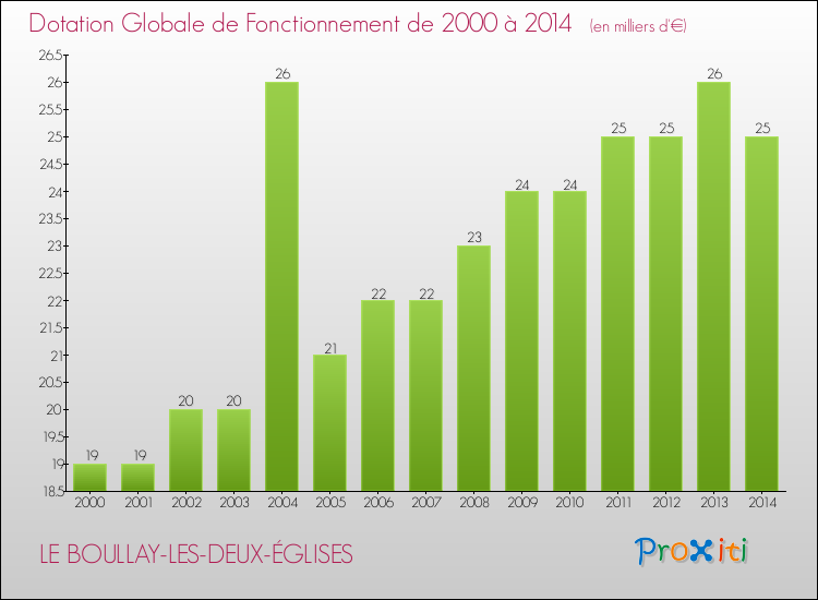 En effet, la dotation globale de fonctionnement versée par l'état en 2014 à la seule commune de Le Boullay-les-Deux-Églises était de : 25 000 € au total.