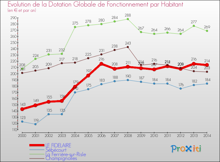 Dans le même temps, la Dotation Globale de Fonctionnement accordée aux communes françaises similaires à Le Fidelaire était de 216 € par habitant, en 2014.