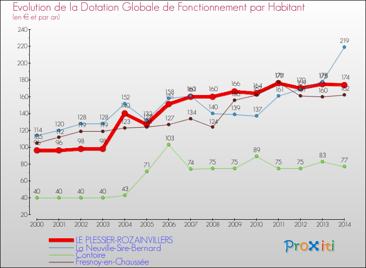 Dans le même temps, la Dotation Globale de Fonctionnement accordée aux communes françaises similaires à Le Plessier-Rozainvillers était de 216 € par habitant, en 2014.