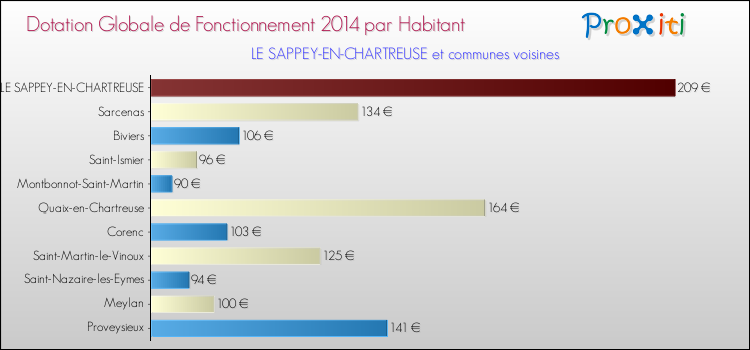 Le graphique ci dessous indique la Dotation Globale de Fonctionnement accordée par habitant à Le Sappey-en-Chartreuse en 2014 par rapport aux communes voisines.