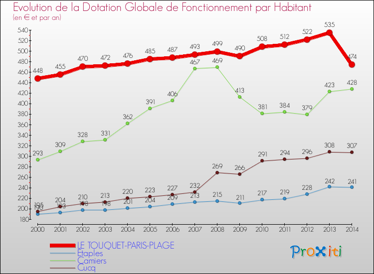 Dans le même temps, la Dotation Globale de Fonctionnement accordée aux communes françaises similaires à Le Touquet-Paris-Plage était de 184 € par habitant, en 2014.
