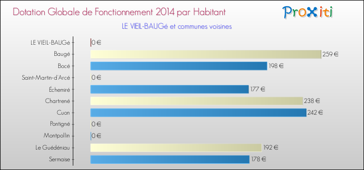 Le graphique ci dessous indique la Dotation Globale de Fonctionnement accordée par habitant à Le Vieil-Baugé en 2014 par rapport aux communes voisines.