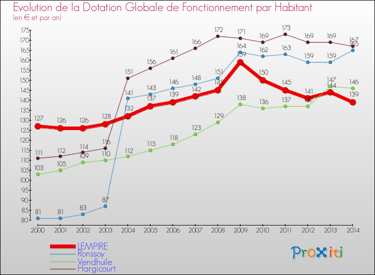 Dans le même temps, la Dotation Globale de Fonctionnement accordée aux communes françaises similaires à Lempire était de 226 € par habitant, en 2014.