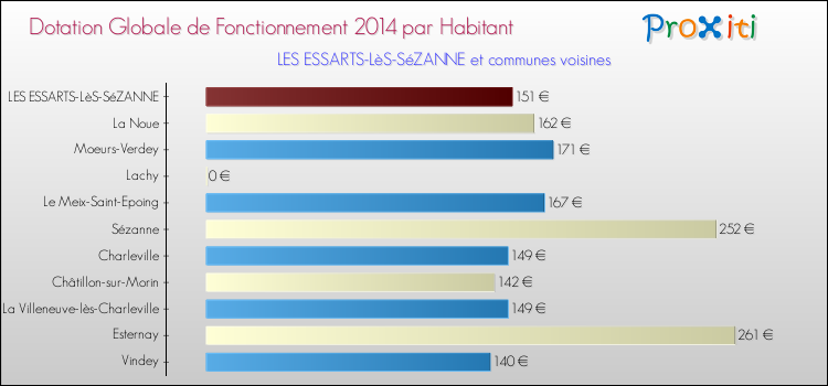 Le graphique ci dessous indique la Dotation Globale de Fonctionnement accordée par habitant à Les Essarts-lès-Sézanne en 2014 par rapport aux communes voisines.