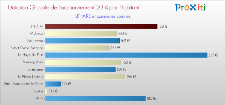Le graphique ci dessous indique la Dotation Globale de Fonctionnement accordée par habitant à Lithaire en 2014 par rapport aux communes voisines.
