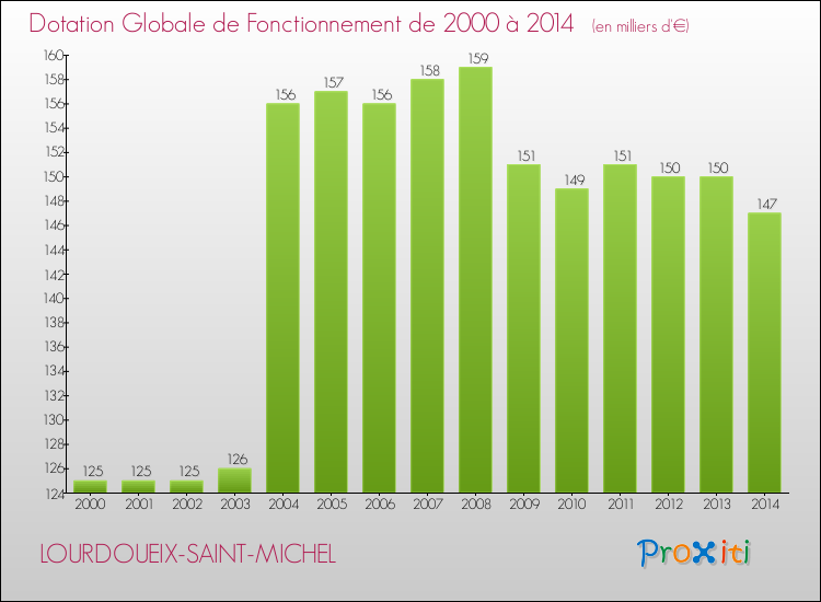 En effet, la dotation globale de fonctionnement versée par l'état en 2014 à la seule commune de Lourdoueix-Saint-Michel était de : 147 000 € au total.