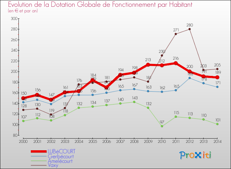 Dans le même temps, la Dotation Globale de Fonctionnement accordée aux communes françaises similaires à Lubécourt était de 230 € par habitant, en 2014.