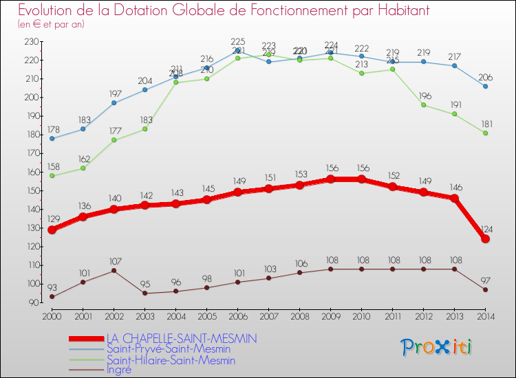 Dans le même temps, la Dotation Globale de Fonctionnement accordée aux communes françaises similaires à La Chapelle-Saint-Mesmin était de 196 € par habitant, en 2014.