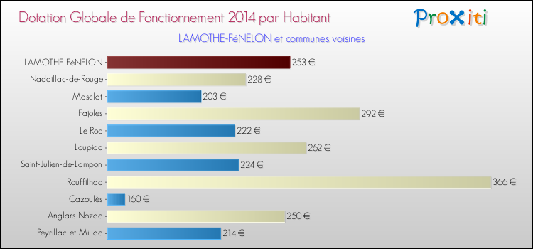 Le graphique ci dessous indique la Dotation Globale de Fonctionnement accordée par habitant à Lamothe-Fénelon en 2014 par rapport aux communes voisines.