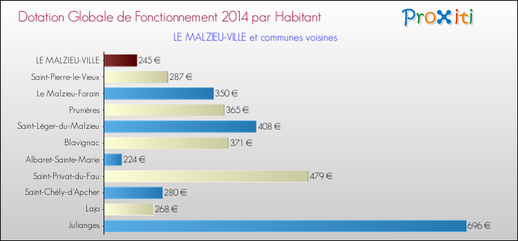 Le graphique ci dessous indique la Dotation Globale de Fonctionnement accordée par habitant à Le Malzieu-Ville en 2014 par rapport aux communes voisines.