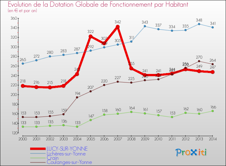 Le graphique ci dessous indique la Dotation Globale de Fonctionnement accordée par habitant à Lucy-sur-Yonne en 2014 par rapport aux communes voisines.