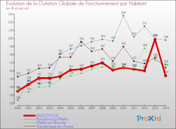 Dans le même temps, la Dotation Globale de Fonctionnement accordée aux communes françaises similaires à Maconge était de 230 € par habitant, en 2014.