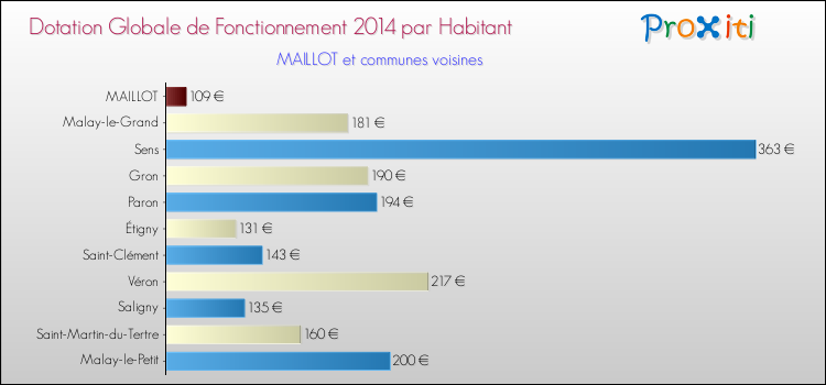 Le graphique ci dessous indique la Dotation Globale de Fonctionnement accordée par habitant à Maillot en 2014 par rapport aux communes voisines.