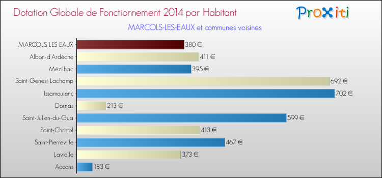 Le graphique ci dessous indique la Dotation Globale de Fonctionnement accordée par habitant à Marcols-les-Eaux en 2014 par rapport aux communes voisines.