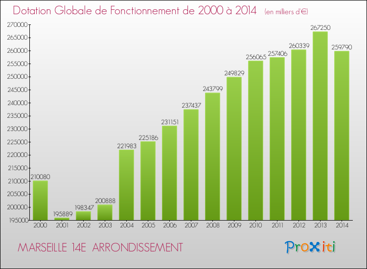 En effet, la dotation globale de fonctionnement versée par l'état en 2014 à la seule commune de Marseille 14e Arrondissement était de : 259 790 000 € au total.