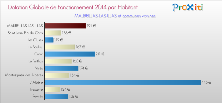 Le graphique ci dessous indique la Dotation Globale de Fonctionnement accordée par habitant à Maureillas-las-Illas en 2014 par rapport aux communes voisines.