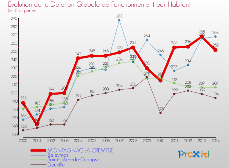 Le graphique ci dessous indique la Dotation Globale de Fonctionnement accordée par habitant à Montagnac-la-Crempse en 2014 par rapport aux communes voisines.