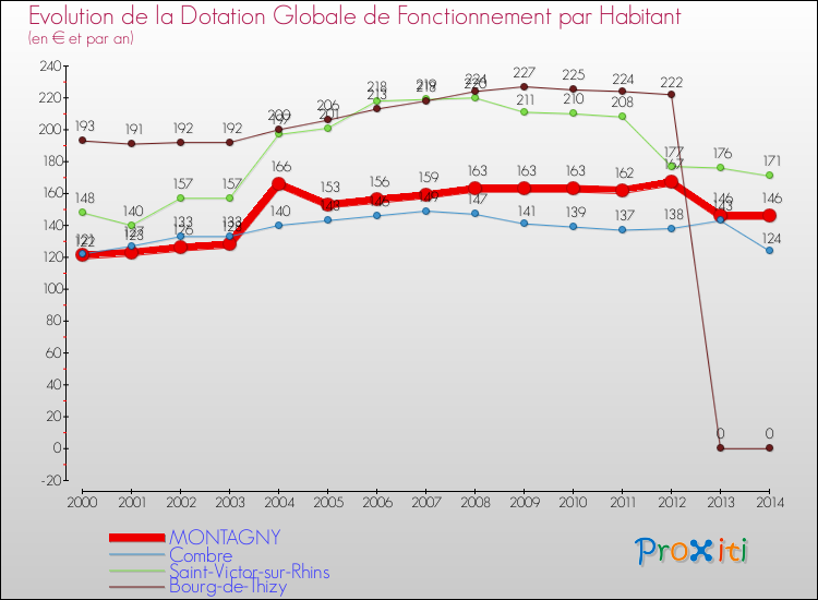 Dans le même temps, la Dotation Globale de Fonctionnement accordée aux communes françaises similaires à Montagny était de 171 € par habitant, en 2014.