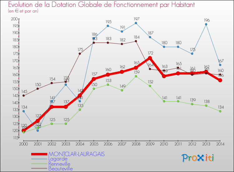 Dans le même temps, la Dotation Globale de Fonctionnement accordée aux communes françaises similaires à Montclar-Lauragais était de 230 € par habitant, en 2014.