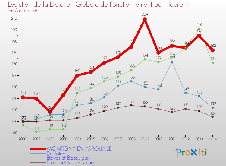 Dans le même temps, la Dotation Globale de Fonctionnement accordée aux communes françaises similaires à Montigny-en-Arrouaise était de 176 € par habitant, en 2014.