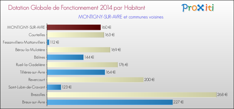 Le graphique ci dessous indique la Dotation Globale de Fonctionnement accordée par habitant à Montigny-sur-Avre en 2014 par rapport aux communes voisines.