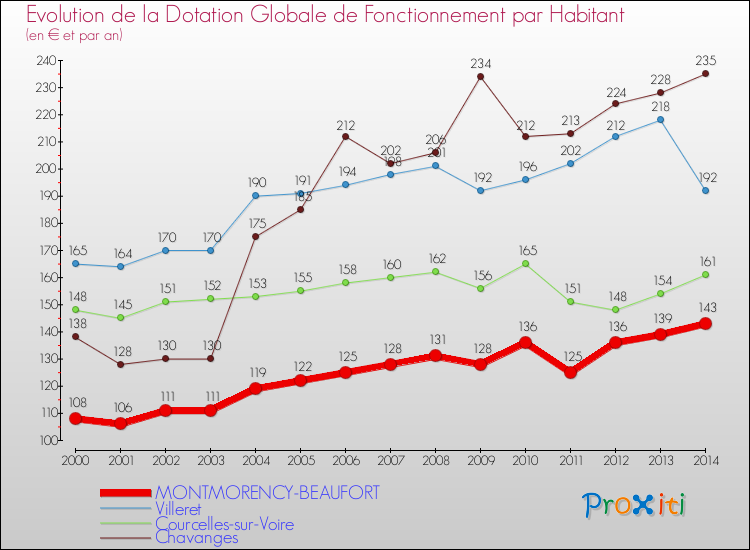 Dans le même temps, la Dotation Globale de Fonctionnement accordée aux communes françaises similaires à Montmorency-Beaufort était de 230 € par habitant, en 2014.