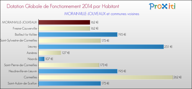 Le graphique ci dessous indique la Dotation Globale de Fonctionnement accordée par habitant à Morainville-Jouveaux en 2014 par rapport aux communes voisines.