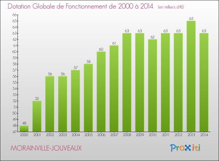 En effet, la dotation globale de fonctionnement versée par l'état en 2014 à la seule commune de Morainville-Jouveaux était de : 63 000 € au total.