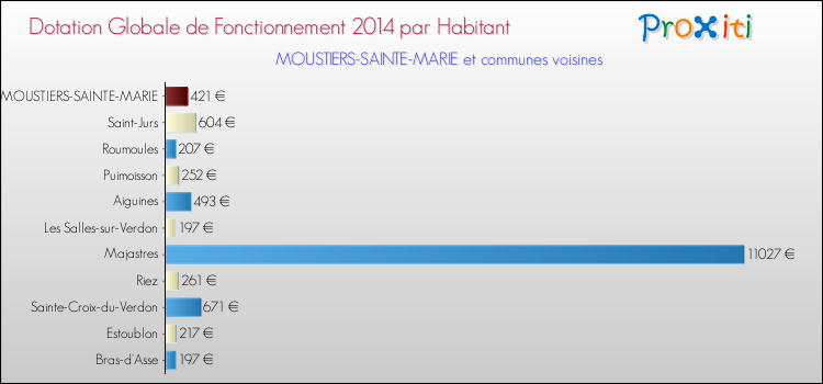 Le graphique ci dessous indique la Dotation Globale de Fonctionnement accordée par habitant à Moustiers-Sainte-Marie en 2014 par rapport aux communes voisines.