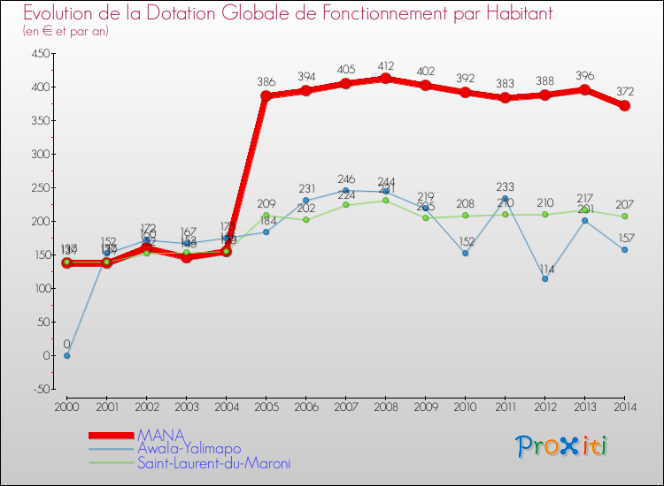 Dans le même temps, la Dotation Globale de Fonctionnement accordée aux communes françaises similaires à Mana était de 196 € par habitant, en 2014.