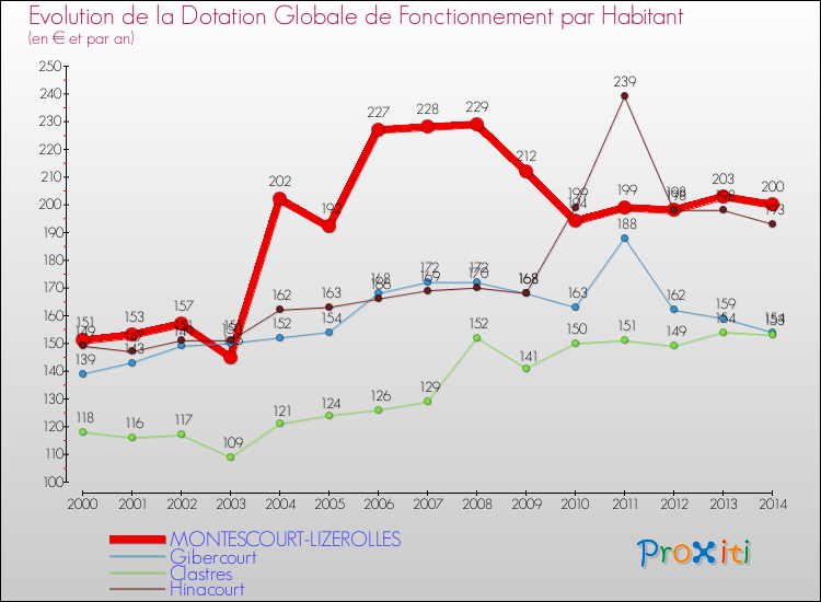 Dans le même temps, la Dotation Globale de Fonctionnement accordée aux communes françaises similaires à Montescourt-Lizerolles était de 171 € par habitant, en 2014.