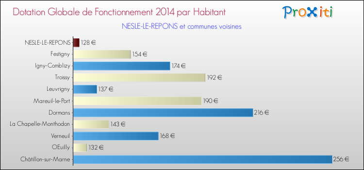 Le graphique ci dessous indique la Dotation Globale de Fonctionnement accordée par habitant à Nesle-le-Repons en 2014 par rapport aux communes voisines.