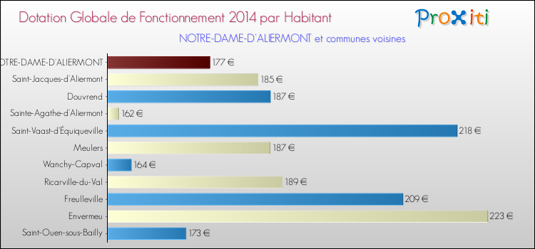 Le graphique ci dessous indique la Dotation Globale de Fonctionnement accordée par habitant à Notre-Dame-d'Aliermont en 2014 par rapport aux communes voisines.
