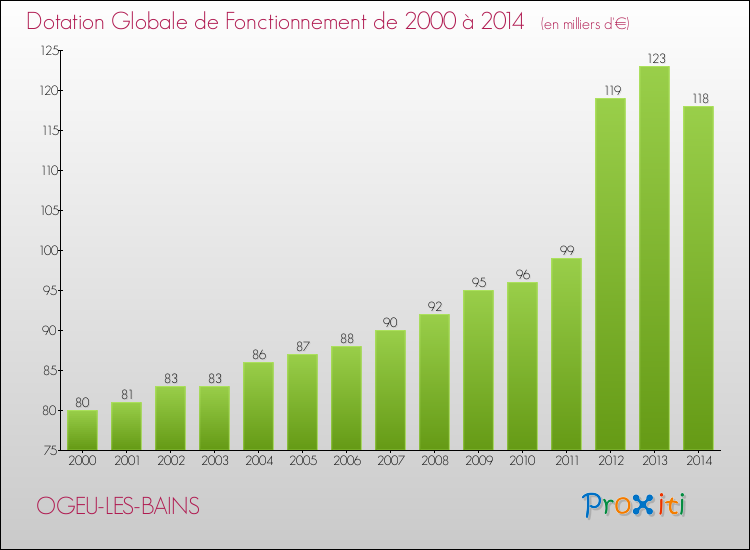 En effet, la dotation globale de fonctionnement versée par l'état en 2014 à la seule commune de Ogeu-les-Bains était de : 118 000 € au total.