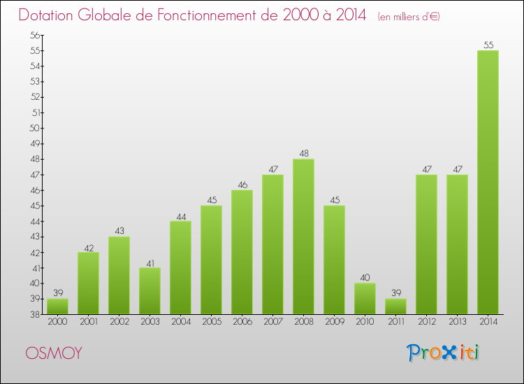 En effet, la dotation globale de fonctionnement versée par l'état en 2014 à la seule commune de Osmoy était de : 55 000 € au total.