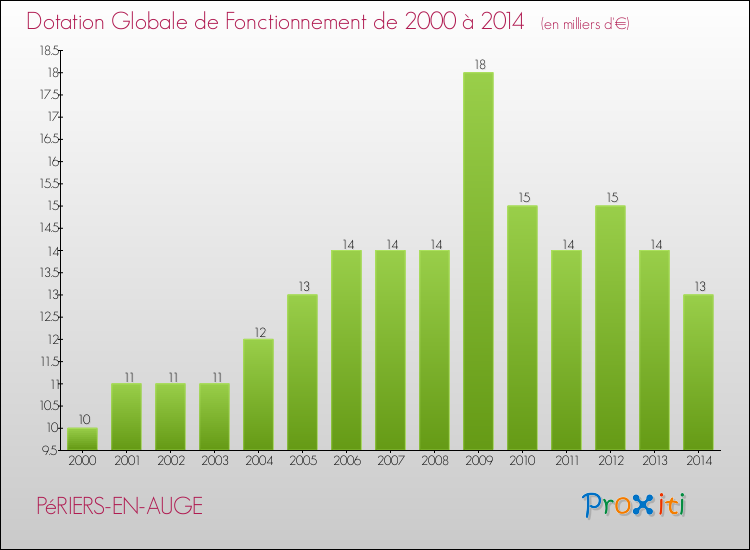 Dans le même temps, la Dotation Globale de Fonctionnement accordée aux communes françaises similaires à Périers-en-Auge était de 230 € par habitant, en 2014.