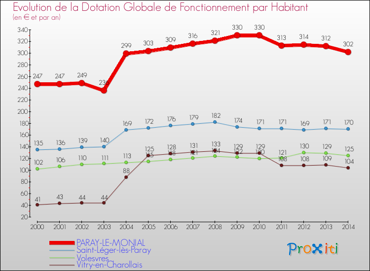 Dans le même temps, la Dotation Globale de Fonctionnement accordée aux communes françaises similaires à Paray-le-Monial était de 276 € par habitant, en 2014.